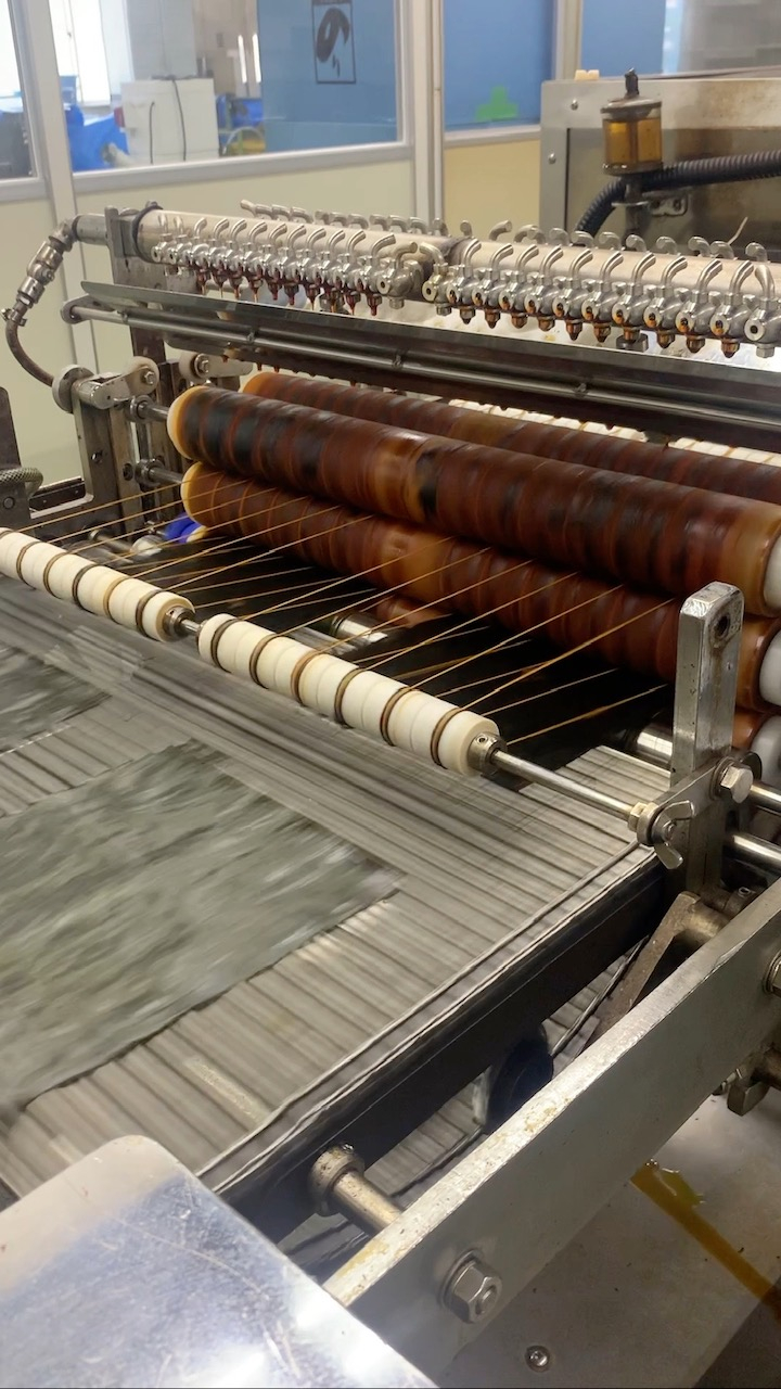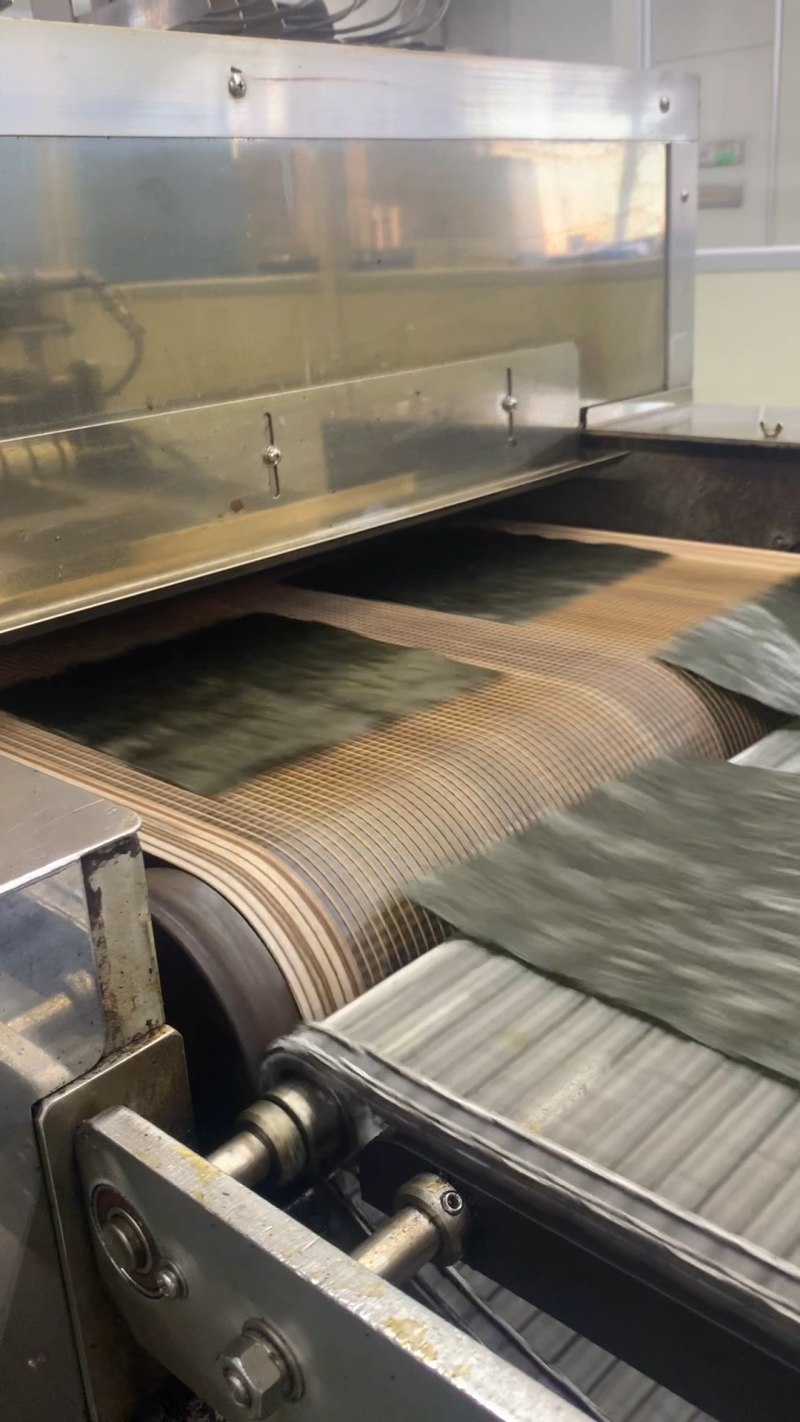 ローラーの間を通過することで、海苔の表と裏の両面に味付しています。